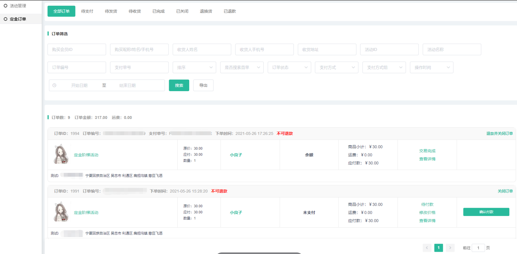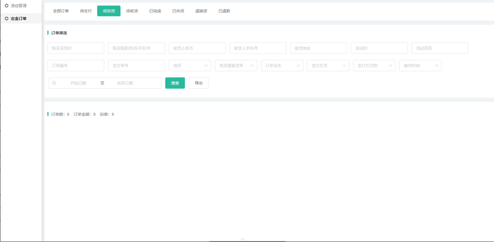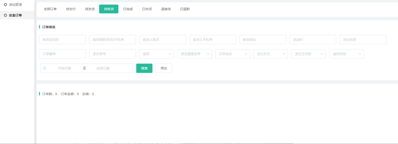 (4)点击定金订单,跳转定金订单页面,自动搜索该活动的所有定金订单;