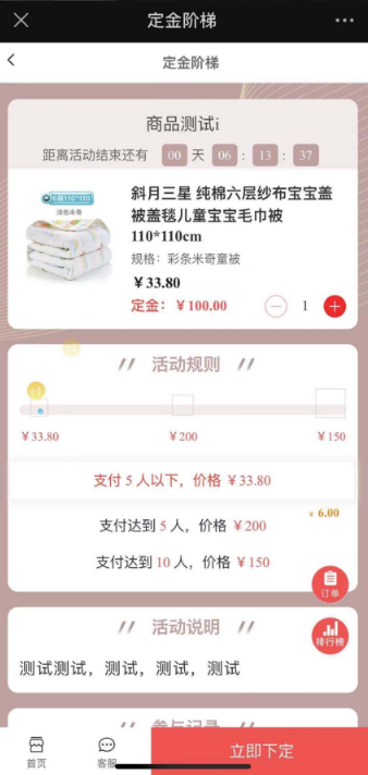 功能概述:定金阶梯团活动开始,会员支付定金,进行分享邀请,活动结束后根据人数或销售数量所在的梯度决定商品活动价,生成待支付订单,会员支付尾款享受优惠。