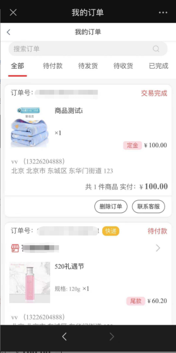 (2)用户可在订单列表页查看尾款订单,尾款订单显示【尾款】字样