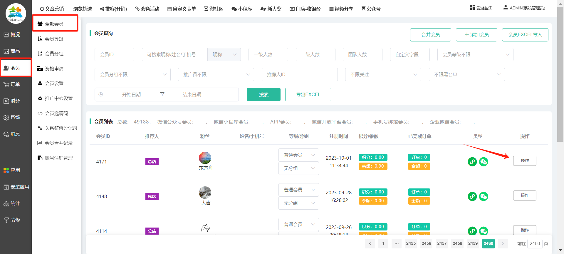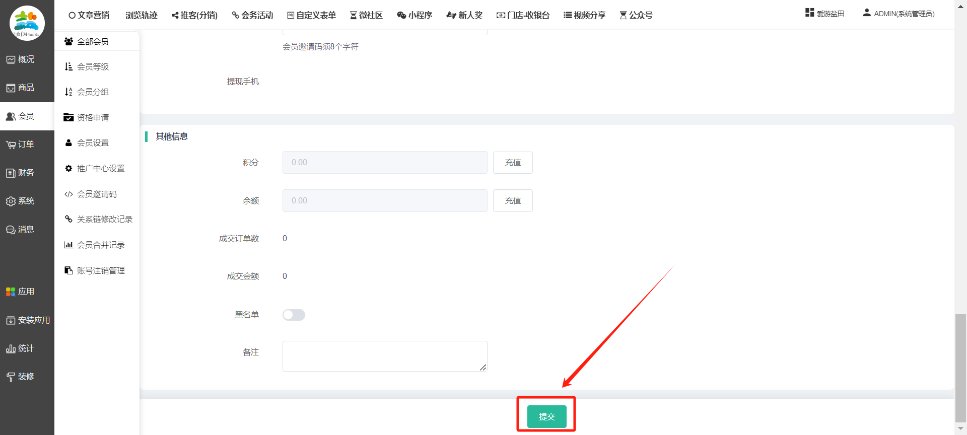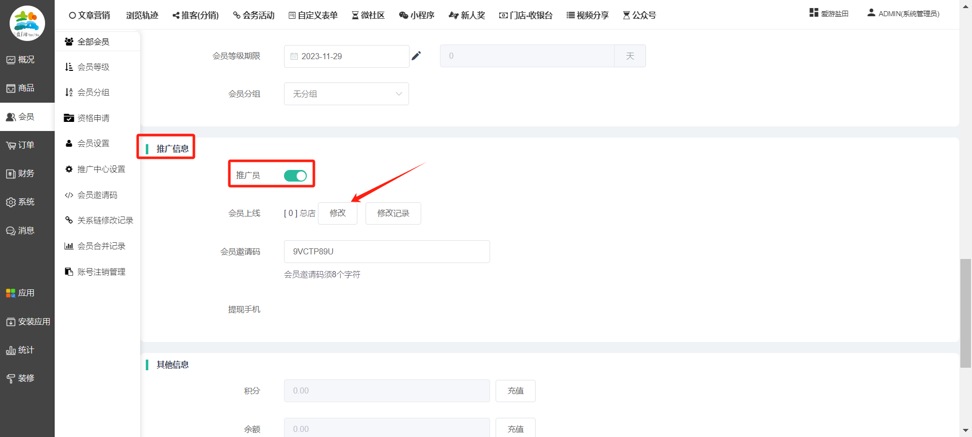 目录 搜索 展开 一、前期准备资料二、数字乡村码-上线操作指南1、服务号的申请流程及认证2、申请小程序流程3、开放平台绑定小程序和公众号三、数字乡村码-系统操作数字乡村码系统管理-概况数字乡村码-商品管理1、发布商品2、商品列表3、商品表单4、商品分类5、品牌管理6、配送模板7、评论管理8、优惠券管理9、商品标签10、退货地址设置11、满额优惠12、批量操作13、配送方式14、基础设置15、商品隐藏四、数字乡村码-会员管理1、全部会员2、会员等级3、会员分组4、资格申请5、会员设置6、推广中心设置7、会员邀请码8、会员关系链修改关系链修改记录9、会员合并记录10、账号注销管理11、会员设置中心五、数字乡村码-订单管理1、订单管理列表2、订单处理流程3、订单状态4、订单修改价格5、订单退款退货6、多包裹发货7、批量发货订单操作步骤8、催发货订单9、物流查询六、数字乡村码-财务管理1、余额设置2、会员余额3、充值记录4、转让记录5、余额明细6、收入明细7、提现设置8、提现统计9、积分管理10、转账审核11、收益广告12、批量充值七、数字乡村码-系统管理1、商城入口2、商城设置①、商城设置②、订单设置③、物流查询④、短信⑤、联系方式⑥、分类⑦、优惠券⑧、分享⑨、幻灯片⑩、广告位⑫、地图设置3、交易设置4、微信模板消息自定义消息模板(新版)自定义消息模板(旧版)小程序消息模板公众号模板消息变更公告5、语言设置6、权限管理7、多媒体管理八、数字乡村码-消息管理九、数字乡村码-应用管理十、数字乡村码系统-数据统计十一、数字乡村码-页面装修DIY1、模板管理2、店铺页面3、顶部导航4、底部导航5、DIY模板市场6、首屏广告7、基础设置8、装修DIY尺寸建议十二、供应商功能插件操作指南1、供应商2、门店-收银台门店申请和使用步骤门店管理①、门店-收银台 营销设置②、门店-收银台 分润设置门店分类门店申请门店审核门店商品门店商品订单收银台订单数据统计核销员基础设置默认设置门店装修3、微社区4、会务活动十三、营销插件操作指南活动报名提货卡新人奖微店问卷调查积分视频分享1、视频分享基础设置2、视频分享发现管理3、视频分享分类管理4、视频分享评论管理5、视频分享分红记录6、视频分享短视频中心每日红包幸运大抽奖签到优惠券二维码任务奖励优惠劵文章音频文章付费文章限时购新海报拓客卡操作流程积分活动素材中心视频红包十四、入驻门店应用类1、门店预约2、附近商品3、门店定位设置4、门店控制5、门店满额包邮6、门店满额减7、导入商品8、门店搜索9、门店股东10、核销券11、多门店核销1、商城后台设置2、前端功能演示十五、常见问题1、后台登录密码修改流程2、会员-余额,积分,后台如何进行充值与扣除3、如何修改上下级关系4、一种万能的获取商城小程序路径的方法 暂无相关搜索结果! 阅读次数:1589 本文档使用 模王系统 发布 8、会员关系链修改 8、会员关系链修改一.如何修改上下级关系?1.会员-全部会员-可以通过搜索用户的独立ID,或者用户微信昵称,找到此会员,然后点击右边的(操作)2.再点击会员详情。3.滑到下面,有个推广信息-会员上线,点击修改4.输入上级的ID号,点击搜索,出来此上级会员后点击选择。5.滑到最下面,一定要点击提交按钮。文档更新时间: 2023-11-30 14:56 作者:链上旅行
