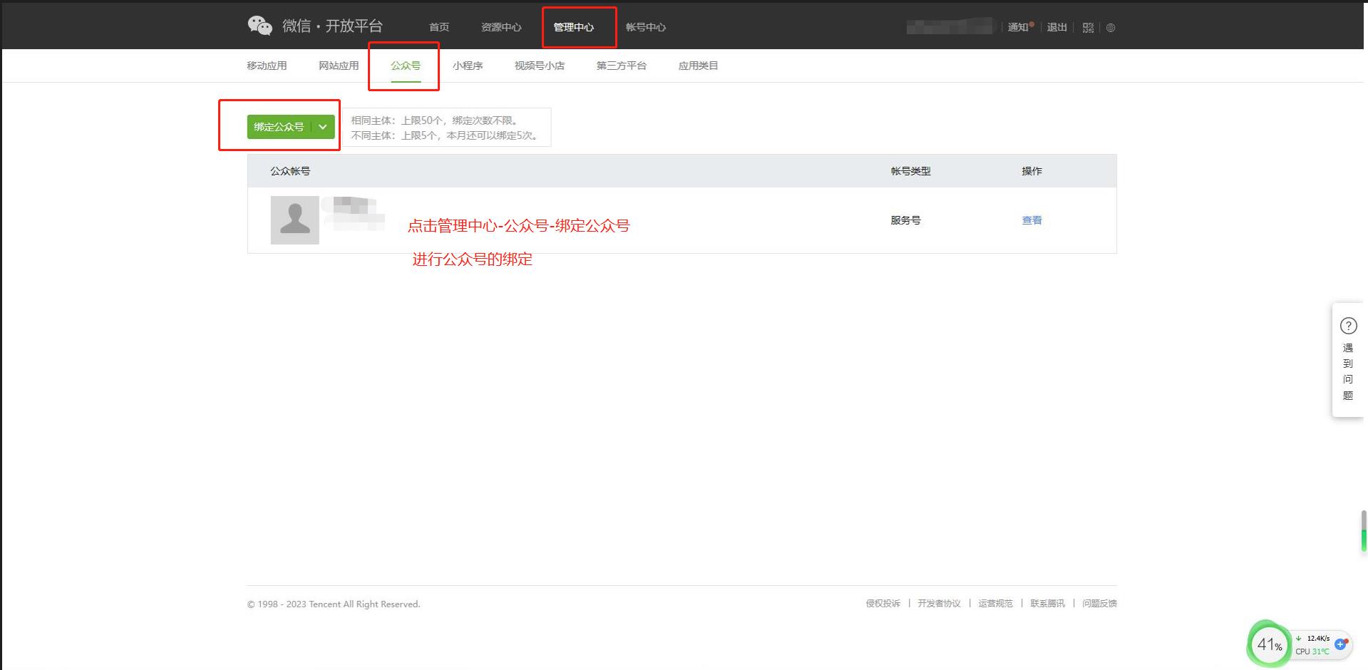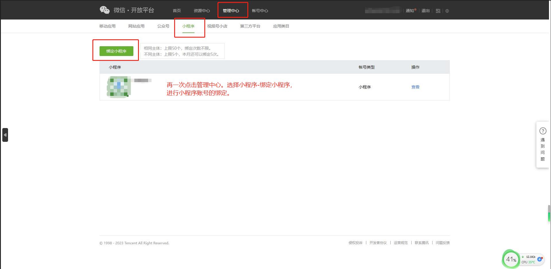 第九步:认证通过之后,点击管理中心,分别选择公众号和小程序,来绑定账号。
