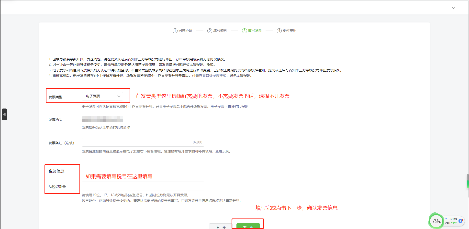第五步:填写发票信息,选择您需要的发票类型,确认发票信息。