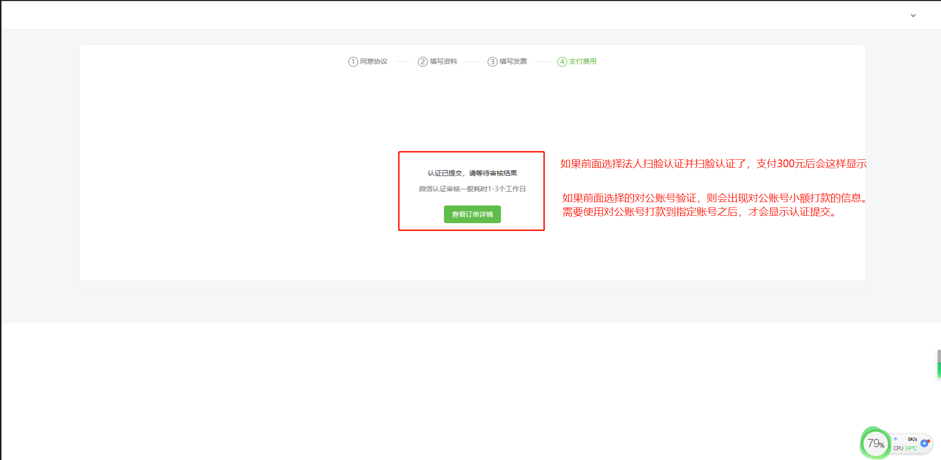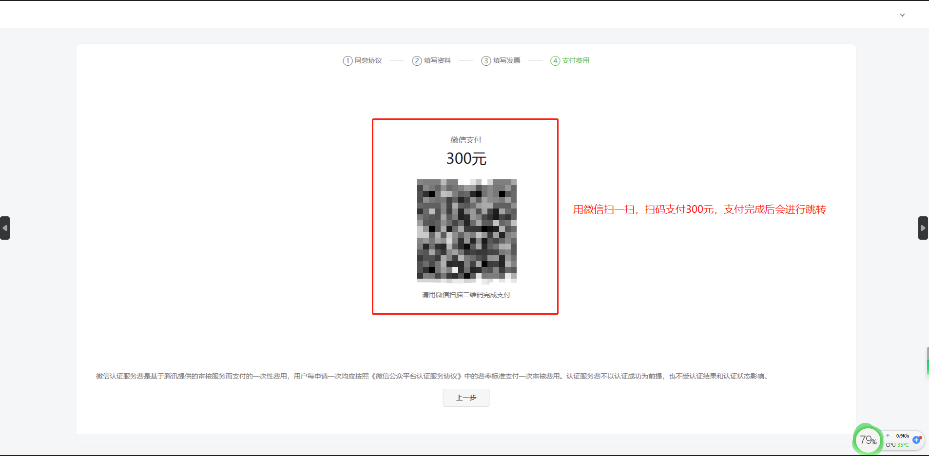 第六步:用微信扫码支付300元、支付完成后等待审核(注意:如果前面选择的是对公账户打款,这时会出现小额打款的信息,进行打款即可)。