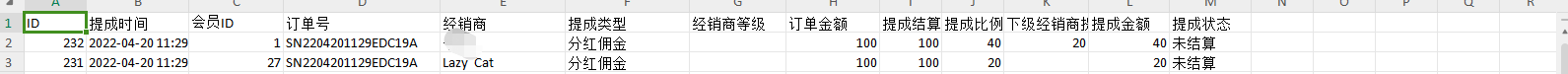 (3)导出:导出excel表格经销商提成明细,可查看到会员ID、提成时间、订单号、经销商、经销商等级、订单金额、提成结算、提成比例、下级经销商提成、提成金额、提成状态 如下图: